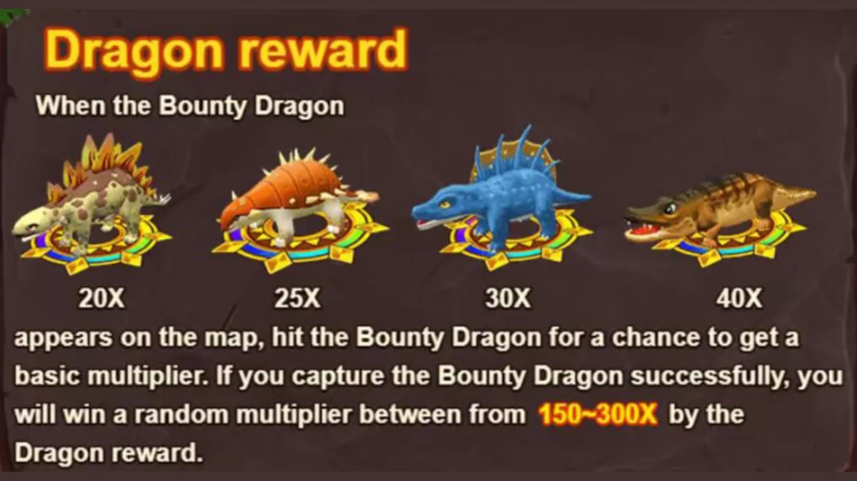 The appearance of the Bounty Dragon on the map signals an opportunity for players to hit the dragon and potentially earn a basic multiplier. Successfully capturing the Bounty Dragon unlocks a chance to win a random multiplier, a generous bounty ranging from 150 to 300 times, enhancing the excitement and unpredictability of the Dragon Reward feature.